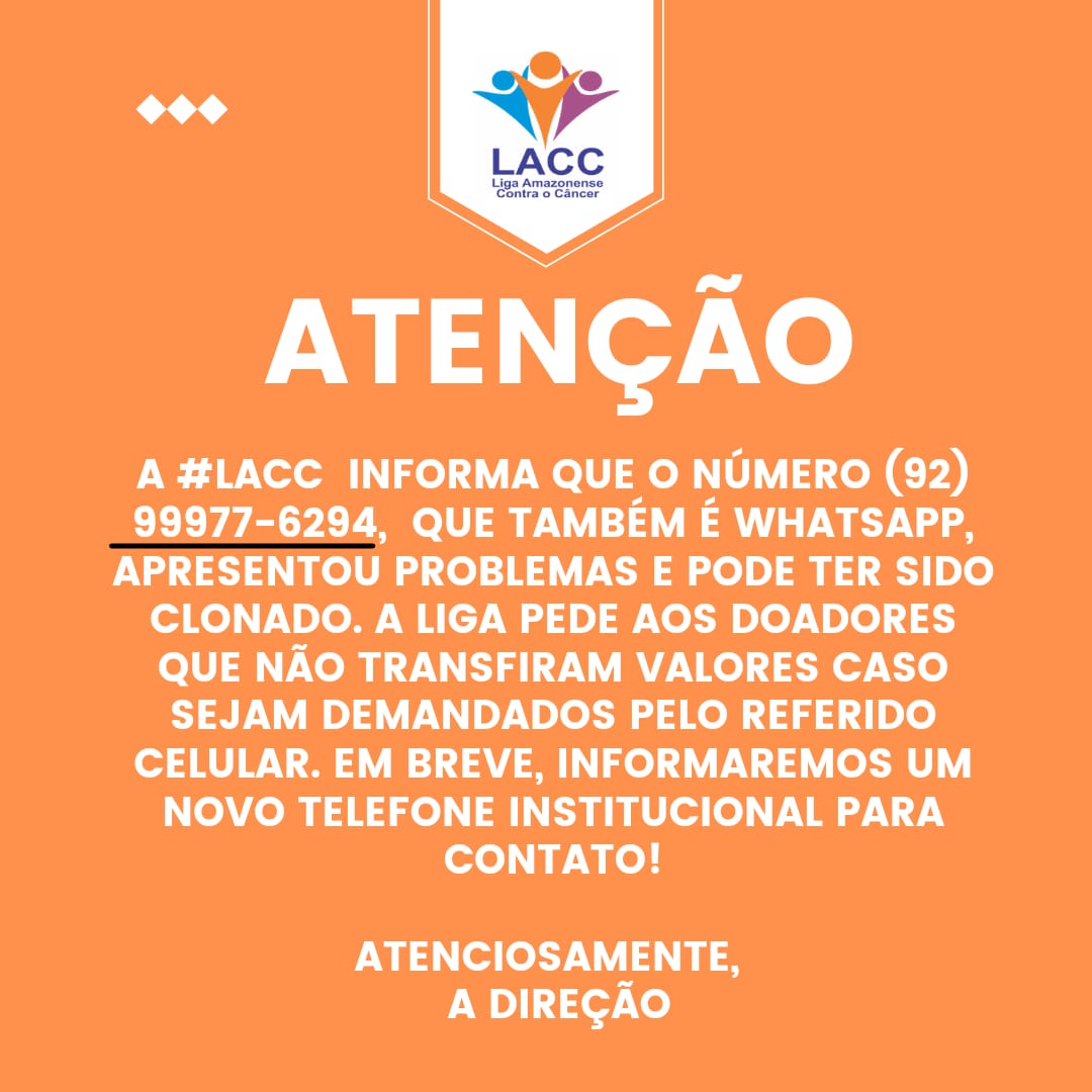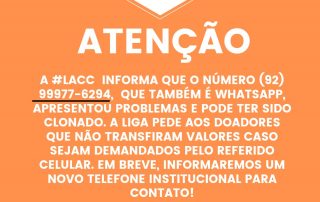 NOTA DE ESCLARECIMENTO A Liga Amazonense Contra o Câncer (Lacc) vem a público informar que o número de celular e whatsapp da ONG, (92) 99977-6294, apresentou problemas, na última terça-feira, 14, e que pode ter sido clonado. Por esse motivo, a ONG solicitou sua desativação e pede aos seus colaboradores e doadores , que ignorem [...]