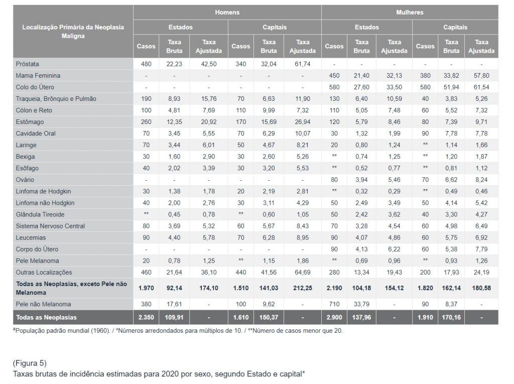 De acordo com o INCA, a Estimativa 2020 para os casos novos de câncer para cada ano considera informações coletadas pelos 27 Registros de Base Populacional existentes no País, que, por sua, vez, integram os dados dos 321 Registros Hospitalares de Câncer. De acordo com a publicação, os cânceres mais incidentes no País no período serão os de pele não melanoma, mama, próstata, cólon e reto, pulmão e estômago. Os números são apresentados por tipo de câncer (19 localizações no total), sexo, regiões do País, estados e capitais.