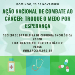 A Sociedade Brasileira de Cirurgia Oncológica (SBCO), seccional Amazonas, e a Liga Amazonense Contra o Câncer (Lacc) realizam, no próximo domingo, 25, na avenida Eduardo Ribeiro, no Centro de Manaus, a Ação Nacional de Combate ao Câncer, que acontece simultaneamente em várias capitais brasileiras. O objetivo é democratizar o acesso às informações sobre os fatores de risco das neoplasias malignas e aproximar a população da comunidade médica, além de esclarecer que o câncer tem cura, desde que detectado cedo e tratado adequadamente. A expectativa de público é de 400 pessoas.